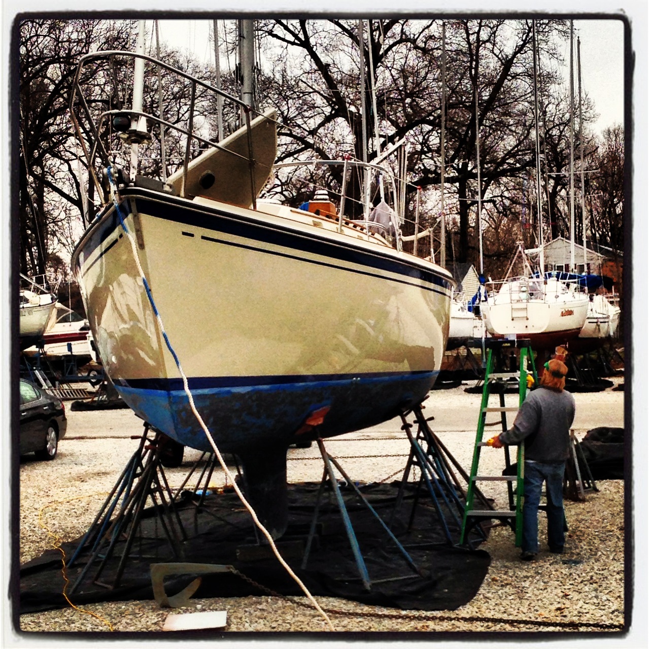 After sanding the bottom, I got to do what I had been waiting all winter for, polishing the gelcoat. The initial cleaning at the end of last year got rid of the stains and marks that Journey had on her topsides, but there was not much shine. I had done some web research and found a forum post where someone seemed to have perfected restoring gelcoats to like-new condition and made some tool and product recommendations that I admittedly bought hook, line, and sinker. It was a little pricey because a new tool was involved, but we figured if it could produce the results it would be worth it and at least the tool could be reused in the future. So I ordered everything back in November in anxious anticipation of getting Journey back to her former beauty. Well after spending 3 full days compounding, polishing, and waxing, we feel like it was worth it. Almost every boat owner working nearby has asked what we used and how we got her looking so good! People just could not believe she was a 1986 boat! We still don’t know if it was the tool, the products, or the technique, but we owe a big “thanks!” to whomever uses the handle Maine Sail for the recommendations and if we ever make it to Casco Bay, Maine, I want to buy him a beer.