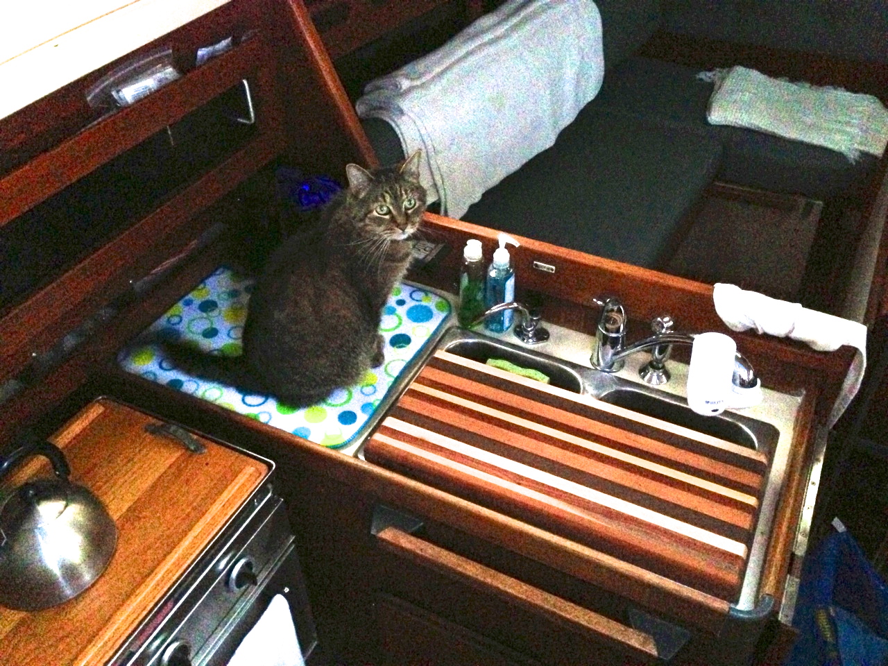 last, he tested his limits in the galley.  clearly house and boat rules are different.  leo would get swatted if he jumped on the kitchen counter at home!