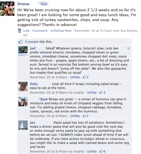 Lunches stumped me, so I asked my Woman Who Sail Facebook group and they gave me about one million good ideas. Here’s a screen shot of some of the thread.