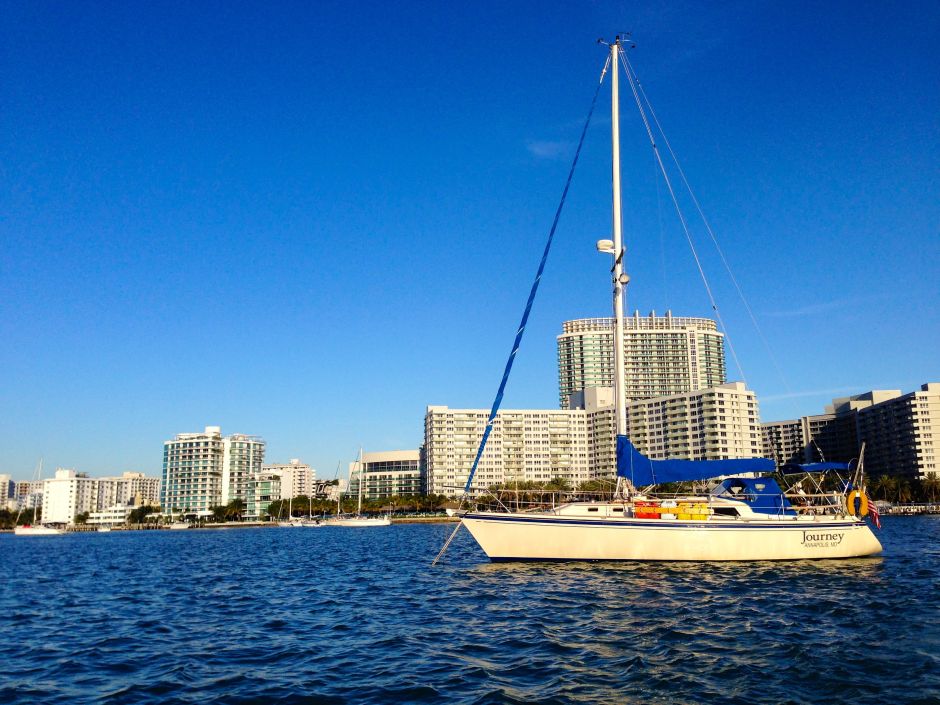 journey at anchor ← Previous Next → Journey, sitting pretty at anchor. That would be South Beach behind her <3