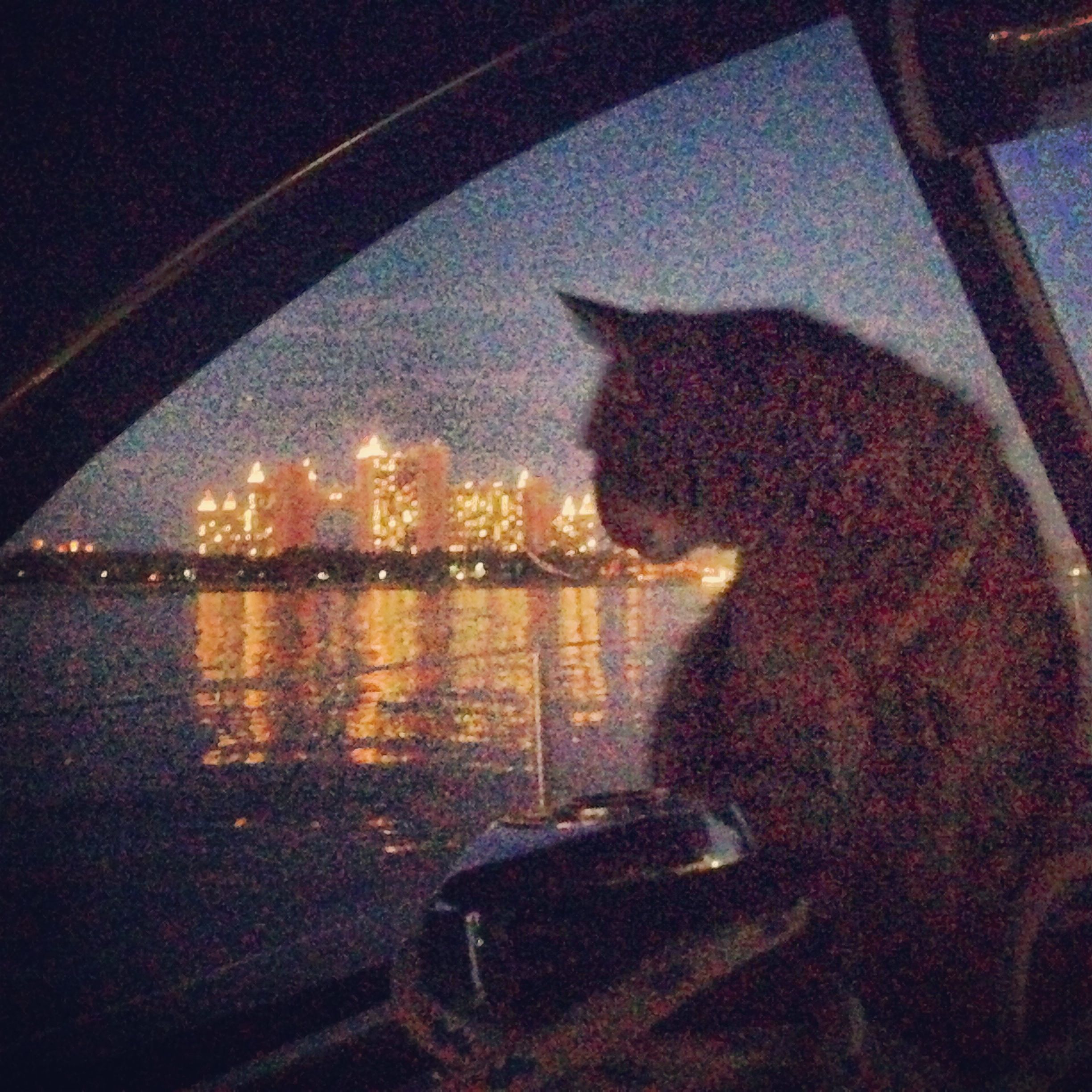 The first night we anchored in front of the infamous Atlantis Hotel and Casino. The sunset was beautiful, with cruise ships also docked off in the distance. Leo had a great view.