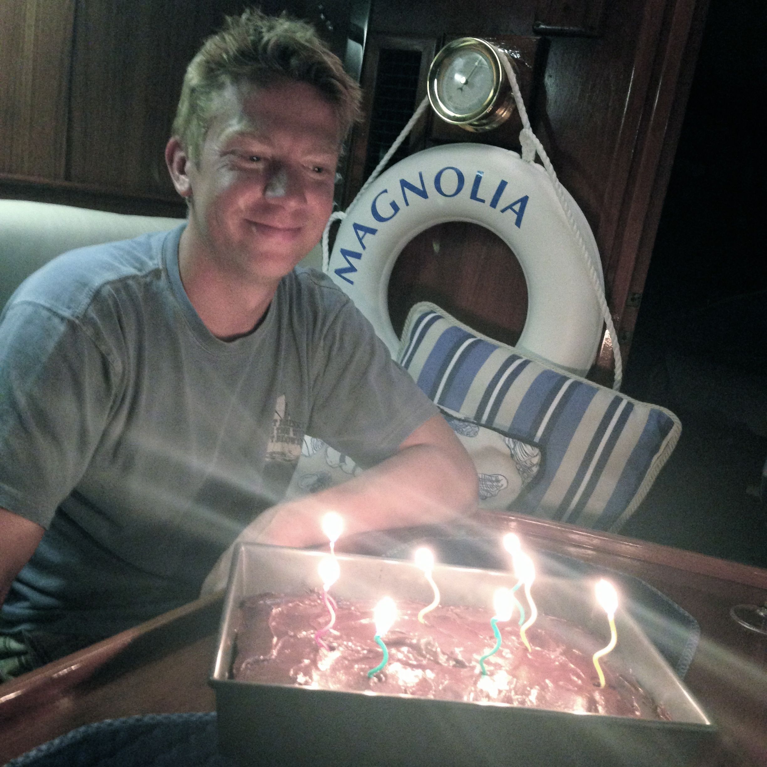 Last stop on our Land and Sea Park adventure was at Cambridge Cay and we timed it so that we met up with some friends from… well, let’s see… they are from Virginia, but I virtually met her through blogging last summer, then we met them in person in Cocoa, FL and again in Vero Beach, so we know them from… cruising, I guess! Anyway, we met up with Annette and Anthony and had a nice dinner with them aboard Magnolia. I also finally baked JR’s birthday cake, so we re-celebrated his birthday, which worked out nicely for Anthony because he has quite a sweet tooth much like JR! For the record, 2 tablespoons of Mayo can be substituted for 1 egg in cake batter. Thanks Boat Galley ;)