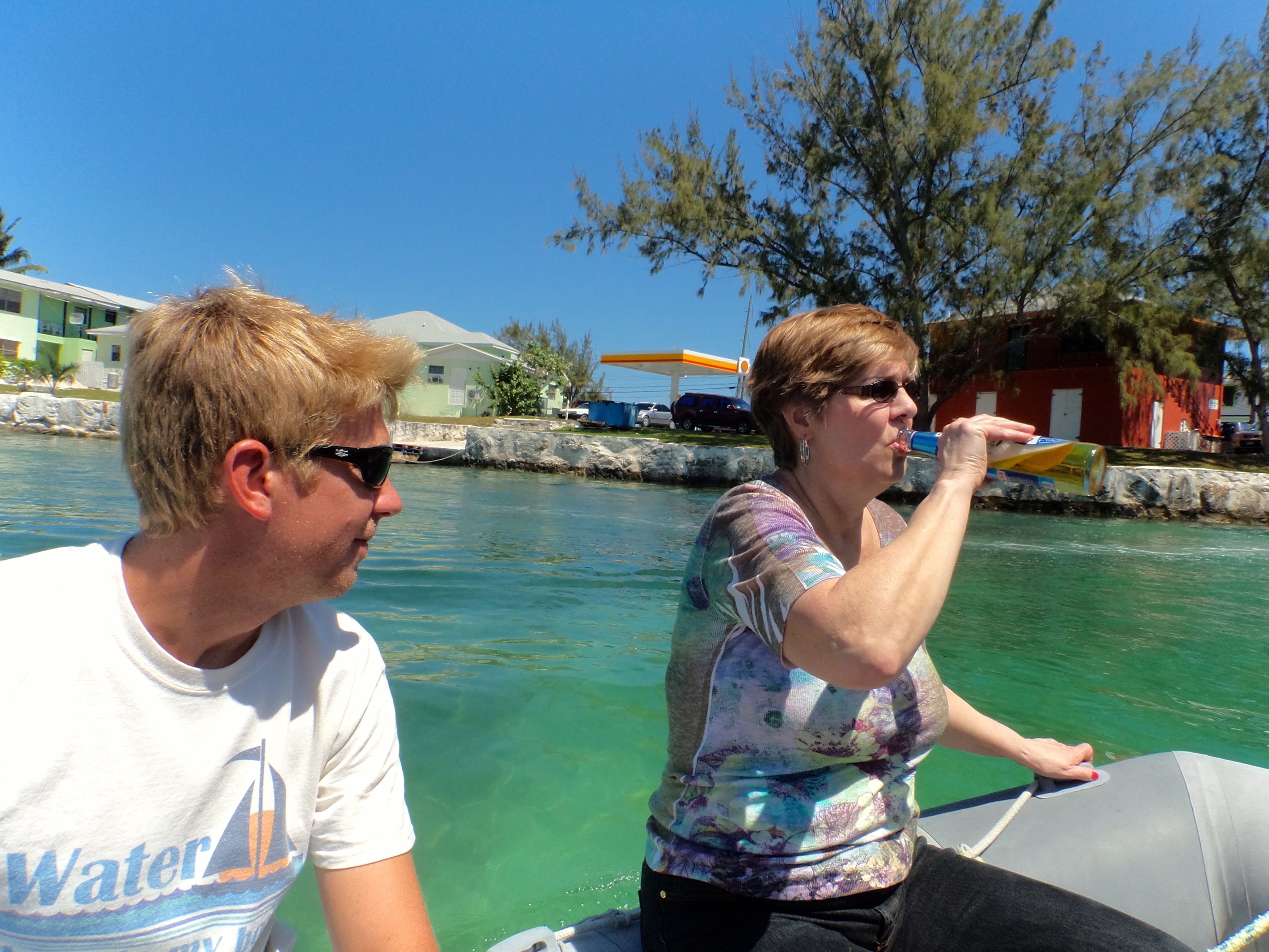 The ride was about 15 minutes to our hotel, Peace and Plenty. We finally arrived to our hotel and were greeted by Drena and Jake (JR)! I haven’t seen them since October and missed them very much!! After our hugs and kisses we walked into our hotel to figure out the situation with our luggage. Once that was figured out Jake escaped and came back with Bahamian beer called Kaliks and we walked the streets with beer in hand! We took a short walk to a dinghy dock and made our way to Journey!