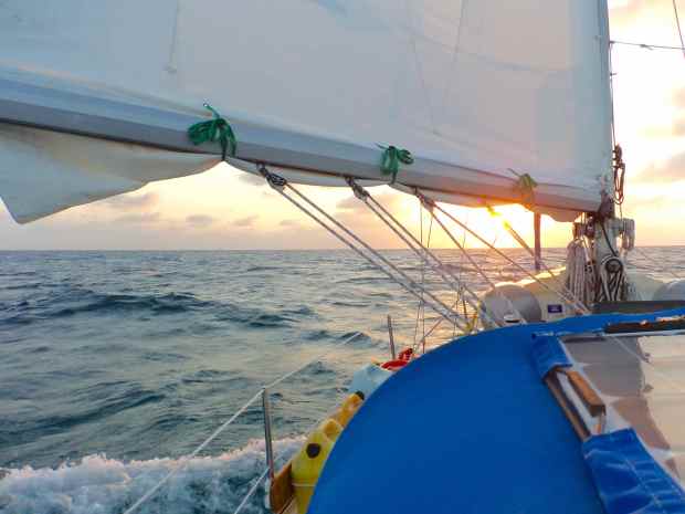 The seas were pretty calm but the wind was right on our stern so we motor-sailed until we got through the Channel and could change our point of sail. Once past the shoals, we were able to shut off the engine and sail with both jib and main for a while. The waves on the Great Bahama Bank were actually larger than they were on the Sound. Again this meant hand steering for us. The wind was in the upper teens by then and we were making such good time that we actually rolled up the jib after only about an hour so that we would not end up in the Gulf Stream in the middle of the night. We had the idea that we wanted to see what we were getting into and wanted to have the option of bailing and heading to Bimini if the waves were too big. It was about this time that Motu had caught up to us and asked what our plans were. They were heading to Port Everglades (Ft. Lauderdale) and knew of an inexpensive place to dock the boat. We had tried a couple of different angles to the wind and waves and found that it would be a more comfortable sail if we headed to Port Everglades and Ft. Lauderdale. Lake Worth would have been doable, but way more rolly. Since the wind was expected to increase to 20 gusting 25 knots over night, we also reefed the main before sunset. So we sailed a course for Ft. Lauderdale with a reefed main all night long. At about 3am, the wind had shifted and we couldn’t maintain our course without jibing, not something you want to happen inadvertently with that much wind (and in the dark), so I had to wake Drena up to help out since the autopilot couldn’t handle even a short time of steering, while I took care of the sail.
