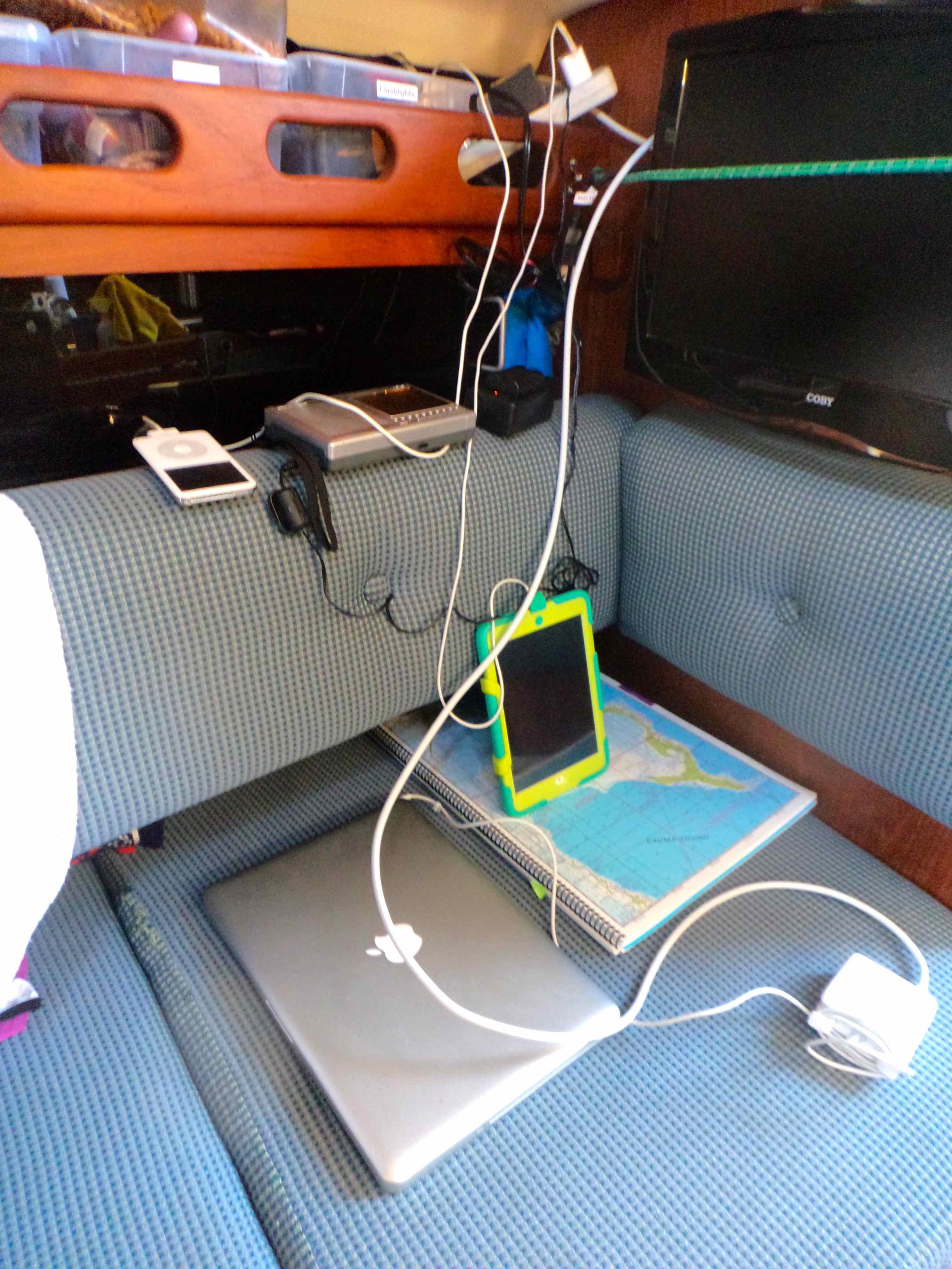 e) Inverter – Journey came with an inverter which, like the windlass, is worth its weight in gold. With all of the portable electronics we brought with us, the inverter gets used EVERY SINGLE DAY. We also feel like the 12 volt chargers have been a little hard on things like the iPhone and iPad, so it’s nice to be able to juice them up on regular AC power.