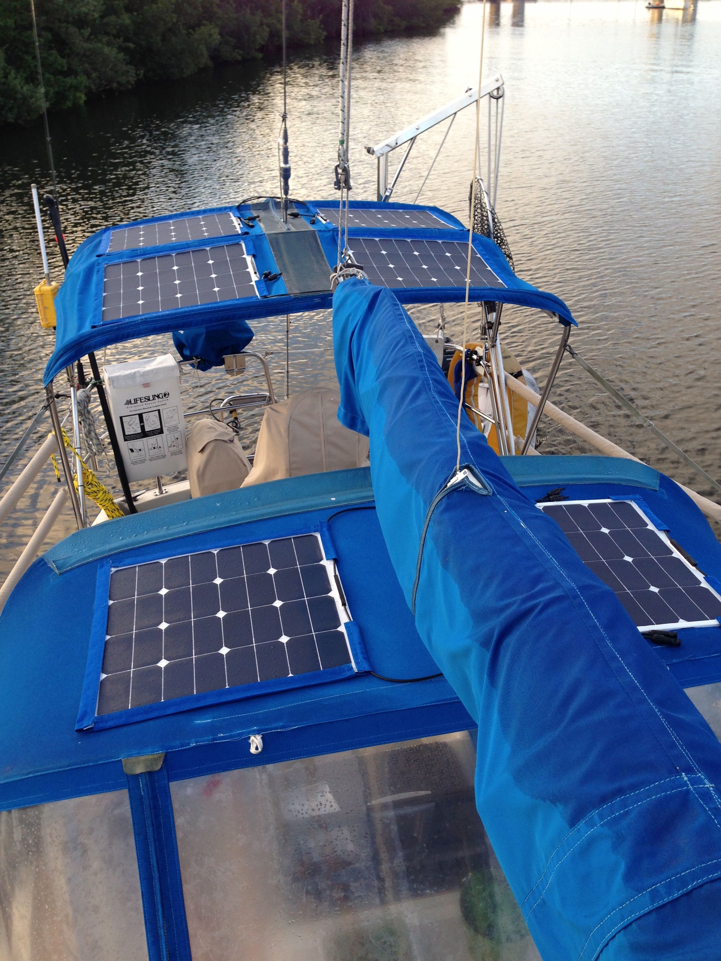 Anybody who knows JR or has been reading this blog for a while, knows how particular he is about things. Sometimes I want to strangle him because he takes forever to make a decision but in most cases, I’m thankful for his “precision.” When we decided to go with the semi-flexible solar panels, JR wanted the mounting to look “finished.” We knew that sewing industrial Velcro on the bimini and dodger and sticking it to the underside of the panel would do the trick, but he wanted it to look a little more custom. He did a bunch of internet research and found these two sites that had examples of “lapels” that held the panels in place and provided “cable management” as our dear friend Mitchell called it :) Also note, we did not use Solbian panels, we used cheaper ones from Discount Solar :)