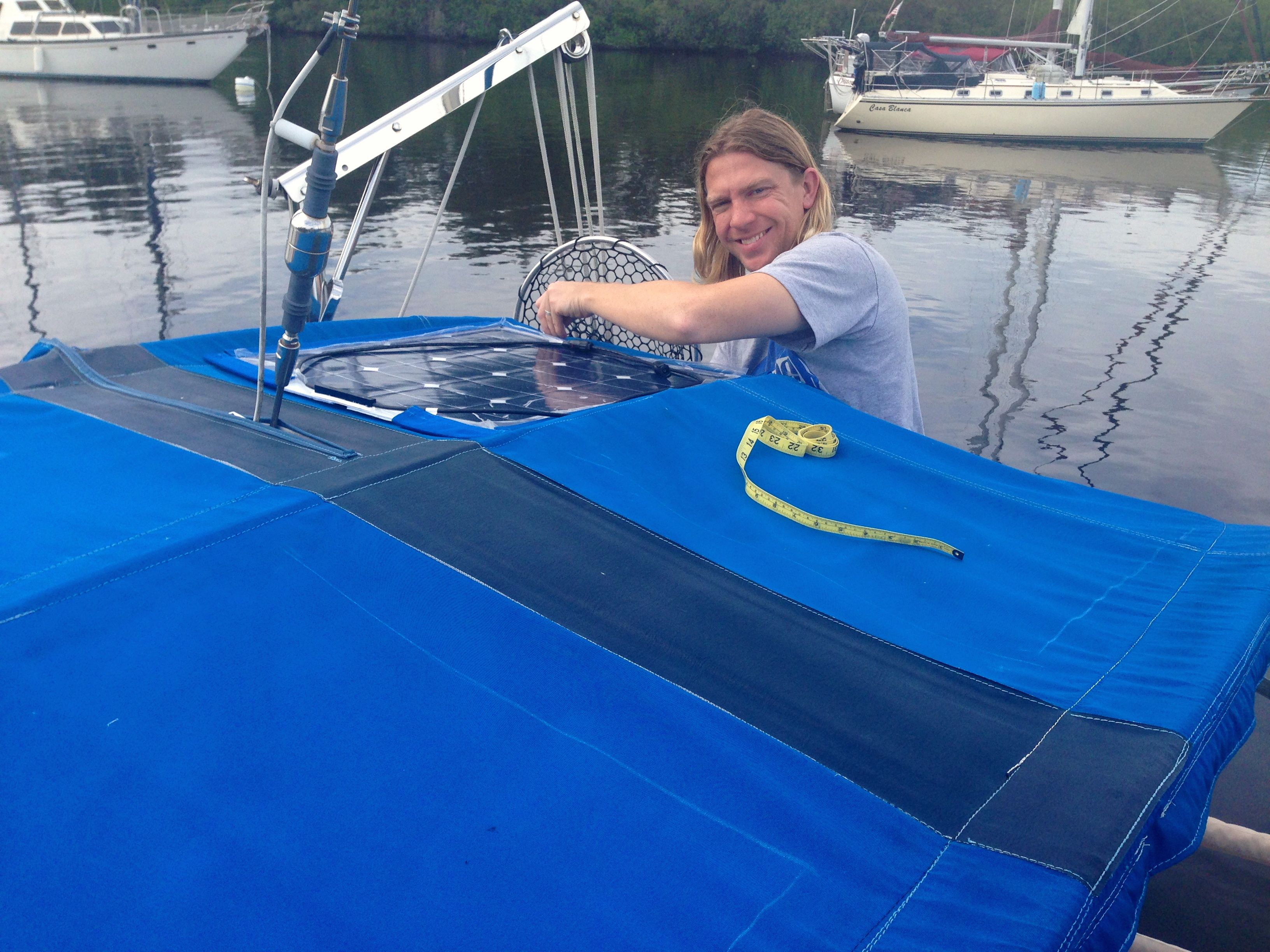 JR had already outlined in tailor’s chalk (gracias Tia!) where the panels should sit on the bimini and dodger and which direction (for cable management, of course!). First he did it with no lapels (actual size of the panels) then he did it with the lapels on (about a ¾” larger all around) that way we had a good idea of where the panels lived once we took the bimini and dodger off!