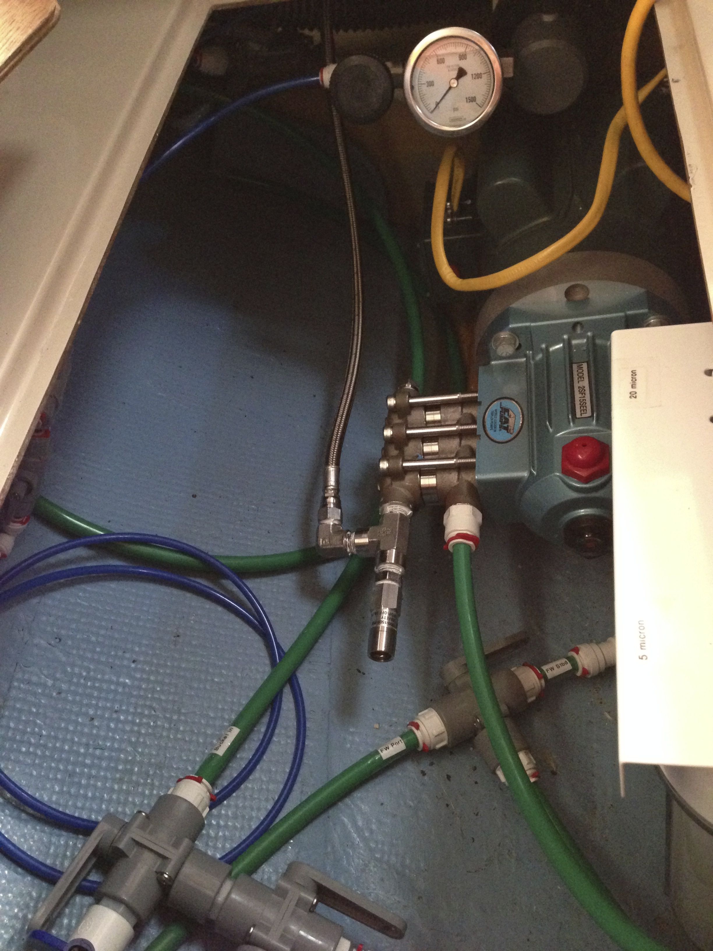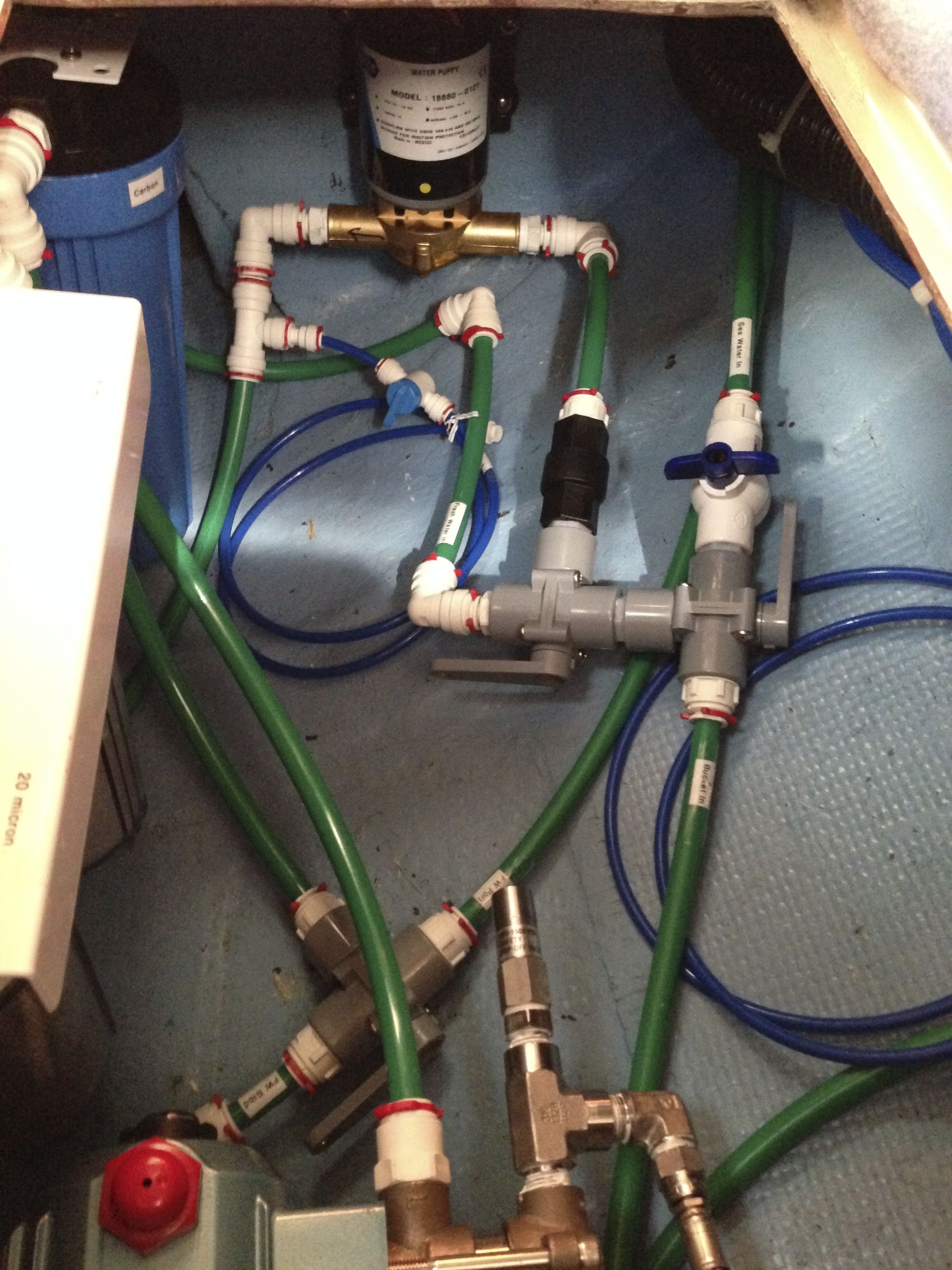 For the image looking aft:  On the right is the pre-filter housing (again) and behind that is the high pressure pump and motor.  The green tubing is the inlet tubing and the stainless steel tubing goes to the membrane housing which is installed lengthwise behind everything above one of our freshwater tanks.  In the top center is the system pressure gauge and to the left of that is the pressure regulating valve.