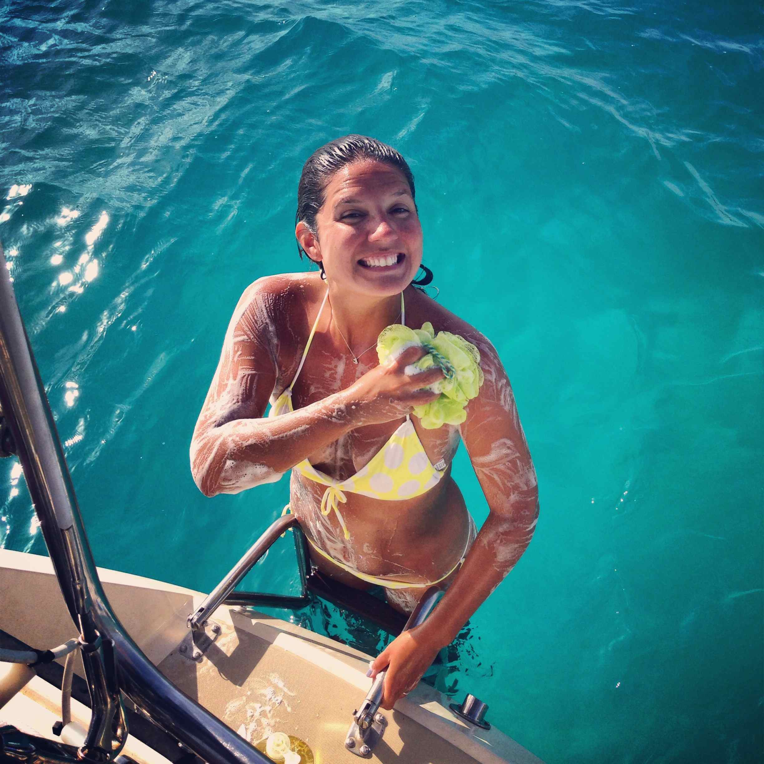 The Bahamas had my favorite showers by far, saltwater! In the Bahamas, we would jump off the back of the boat, lather up, rinse off, then climb into the cockpit to do a freshwater rinse. My hair has been a pain in the booty just because it takes so much water to rinse, so shampooing and conditioning in the saltwater was ideal. Rinsing off didn’t use up too much of our precious water (and in the Bahamas we were still using our watermaker so we didn’t have to conserve as much)! I could also sit on our “sugar scoop” in the back and do all my shaving and exfoliating with a killer view. Not as tempting to jump in and clean up here on the ICW!