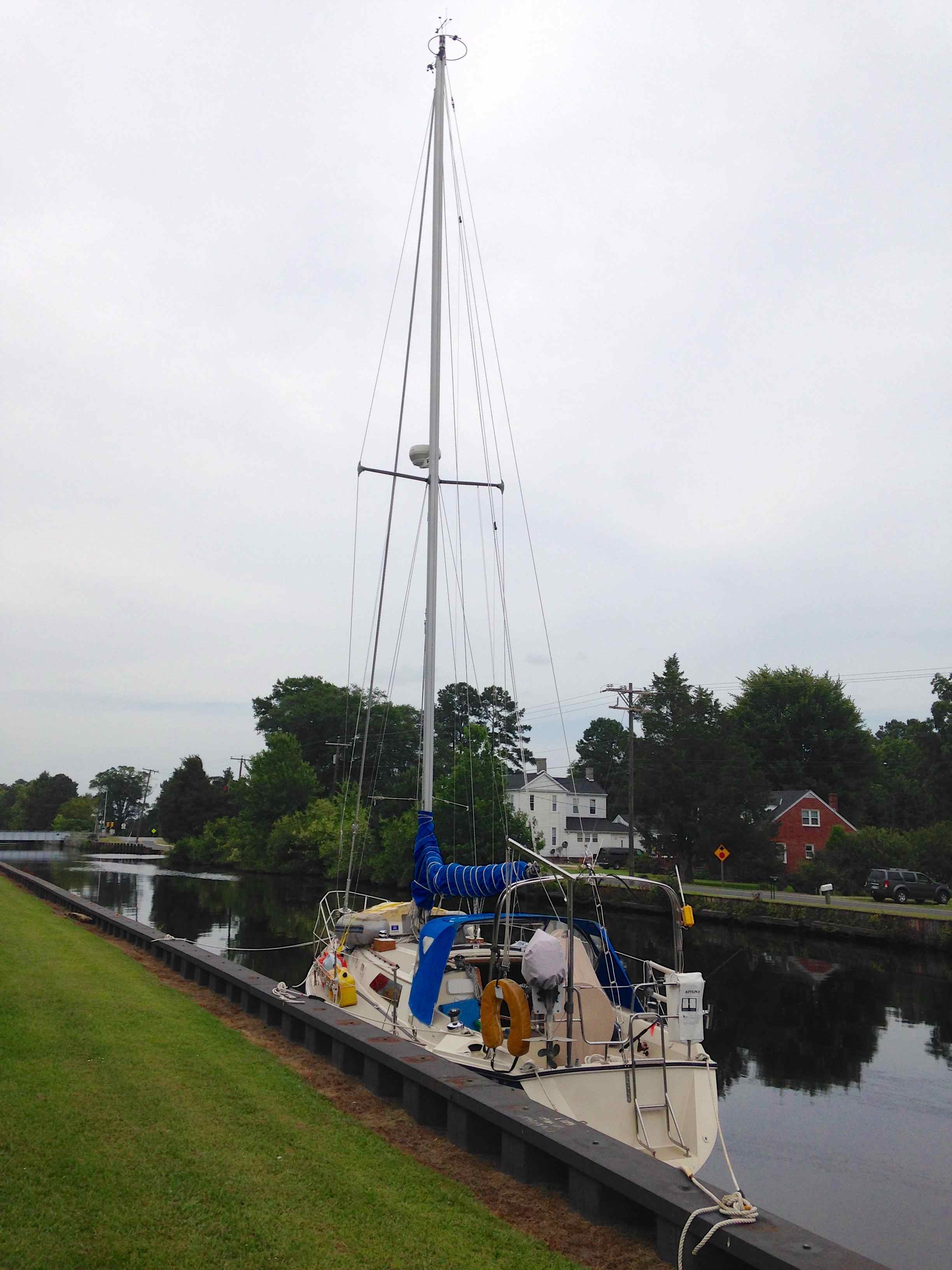 We did some regrouping and used Elizabeth City’s free wi-fi to reach out for advice. The locals all said that you really don’t want to be at the free docks for a storm, the other side of the Elizabeth City bridge is always more protected, so we had a few options there. Our cruising God Parents, Tammy and Chip contacted us and were advising as well, they are very familiar with NC water! And lastly, I posted to my Woman Who Sail (WWS) Facebook group and asked for local knowledge. The response from all of these resources was fast and overwhelming (in a good way.) Our options were: 1) a bulkhead at Jennett Brothers Food Distributers free dock right on the other side of the bridge 2) A couple of small marinas in Elizabeth City 3) Goat Island anchorage about 10 miles north of Elizabeth City 4) South Mills bulkhead (wall) about 17 miles north in the Dismal Swamp Canal 5) The Dismal Swamp Visitor Center docks, about 22 miles north of Elizabeth City. Options are good. We took all this info to the new Elizabeth City showers and took nice, long, thinking showers. We talked it over at Hardees while we ate a fast, greasy dinner, and we talked some more once we got home. On Wednesday night, tied up to Elizabeth City’s free dock, we decided to head for the South Mills bulkhead with plenty of time to 1) continue on to the Visitor’s Center if it looked shady 2) do all of our prepping 3) turn around and hit Goat Island or Jennett Brothers if need be. Ahhhh… A plan.