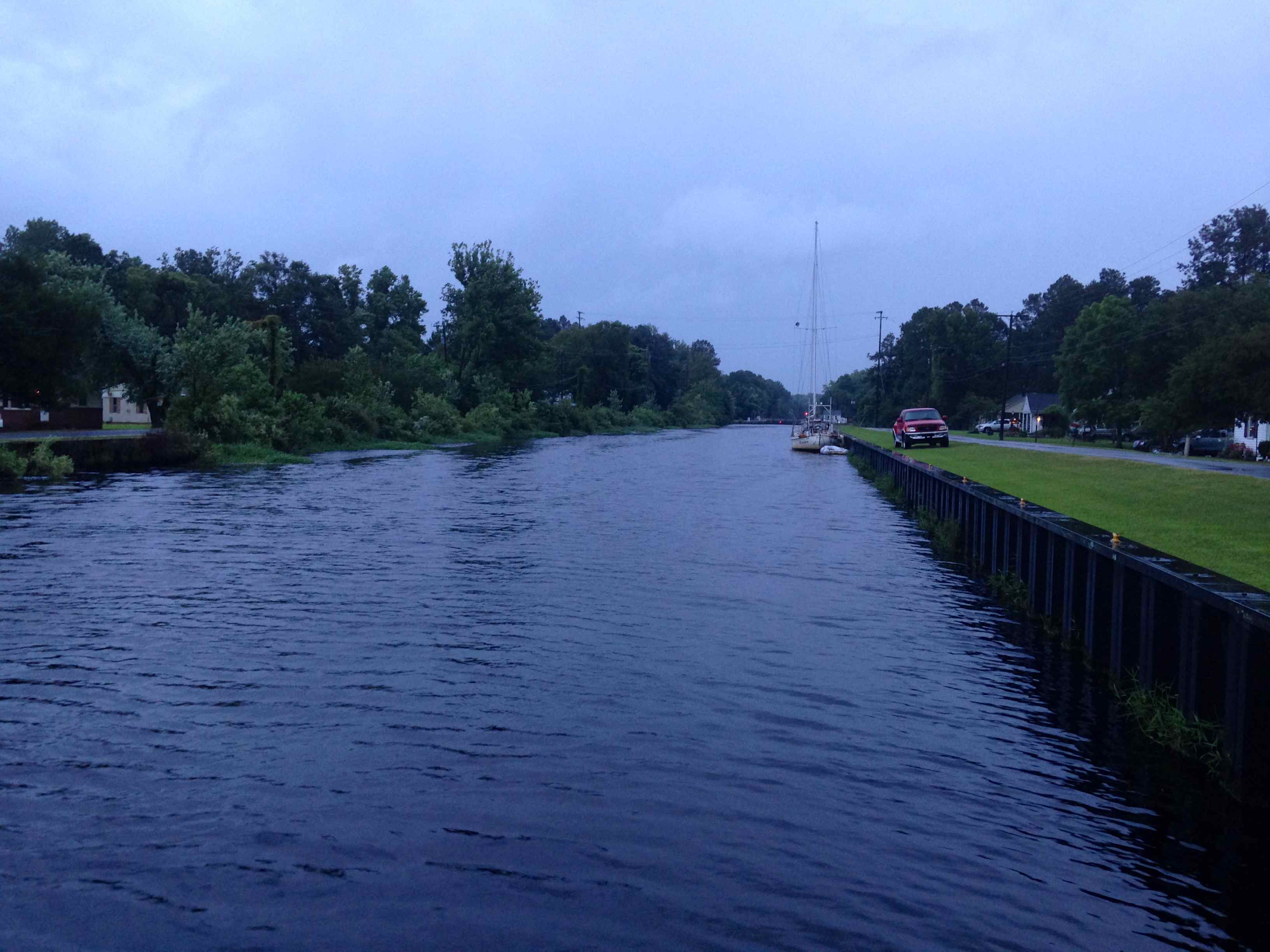 The next day was long as well and we made it to the top of the Alligator River. Because we are cheap and have T-Mobile, we didn’t have an internet connection and couldn’t see that the storm was officially a tropical storm now (not a depression) and that it was gaining momentum! We were listening to the National Weather Service voice broadcast on the VHF and found that the storm was going to hit Thursday night/Friday morning instead of Friday day. We decided that we didn’t really want to travel far on Thursday because we had A LOT of stuff to do to prepare our little boat for a tropical storm so we reassessed and decided that the Elizabeth City free dock could work for us. Our biggest fear was that the docks would be full. Ha!