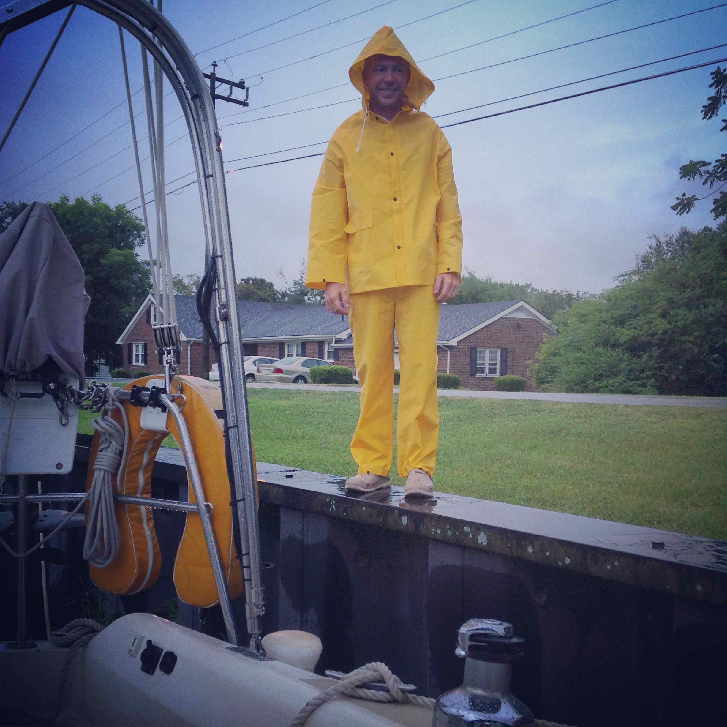 I re-packed our ditch bag to include (in addition to the normal stuff) some food for Leo, dry clothes, shoes, cash, meds (thanks Jaye!), and more snacks. We charged all of our electronics and emergency stuff like the portable VHF and the spotlight. I pulled out and organized our foulies, head lamps, harnesses, life jackets, extra lines, and swimming goggles. I read the tip about the swimming goggles from Carolyn at The Boat Galley. She said to use your snorkel mask so that if the rain is pelting you in the face, you can still see. I thought this was brilliant and wished that I had read it a month ago before we started dodging summer thunderstorms. The swimming goggles were more accessible, so I went with those. JR kept laughing at me because I was insisting on the life jackets and harnesses. He kept saying, “One step and I’m on land!” “I can stand up in the water in this canal!” But, because he is nice, agreed to use them if he went outside <3