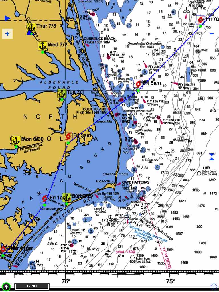 JR tracked the actual path of Arthur here as the dotty blue line.  The 4 anchors represent where we stopped since Monday.  A little too close for comfort!